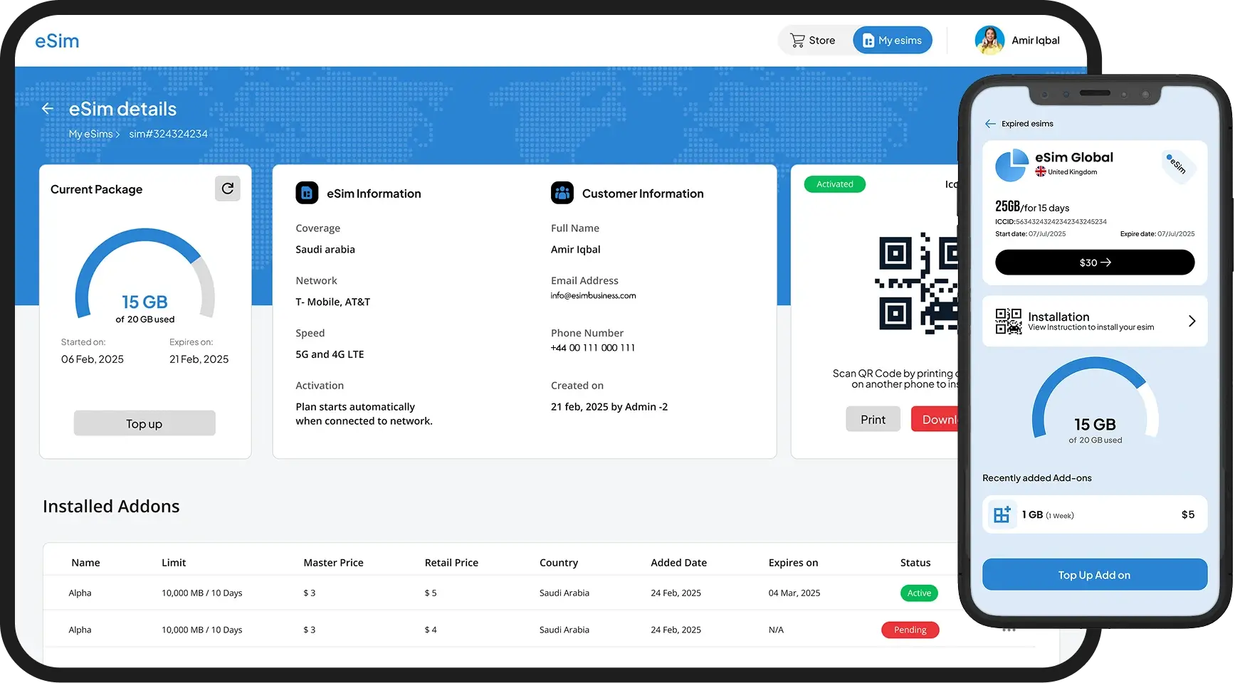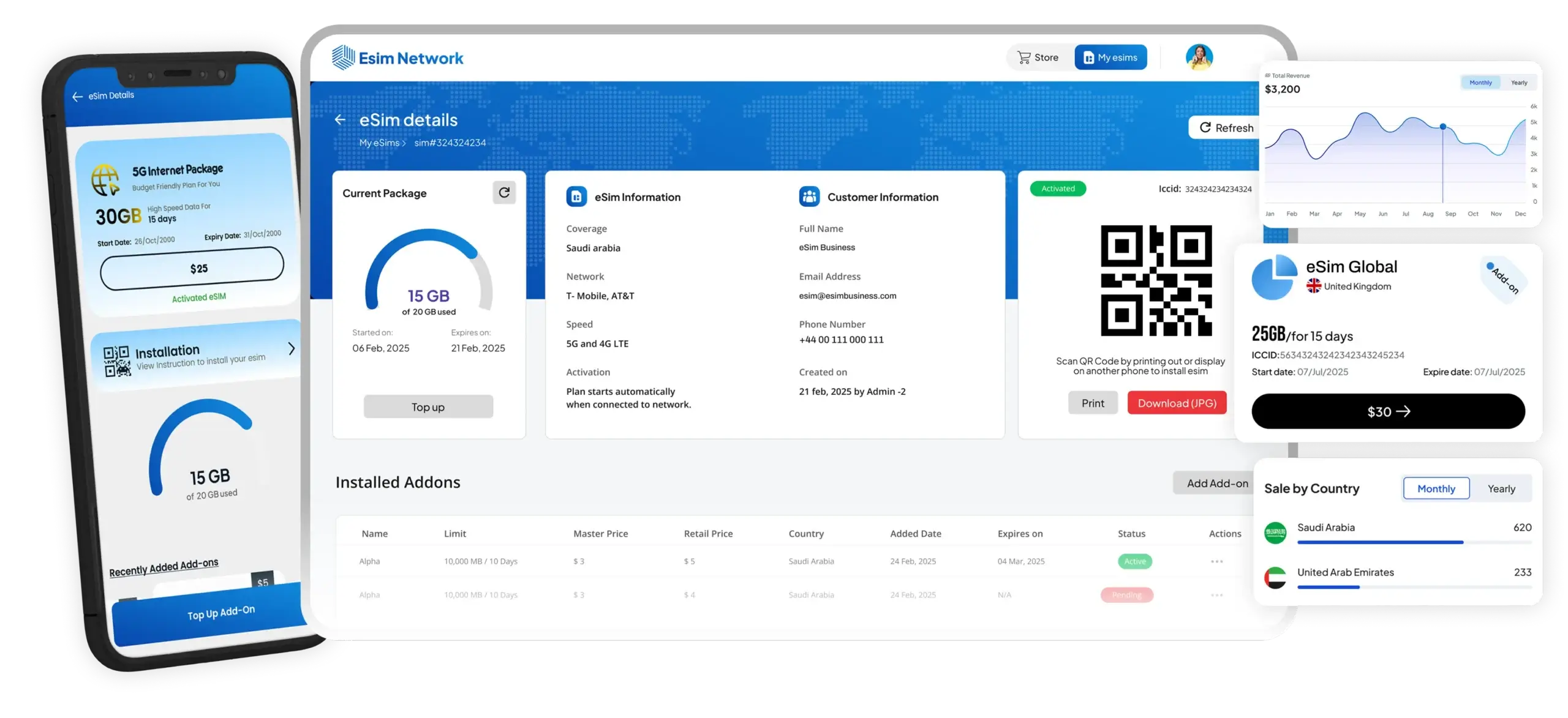 Upgrade to our full-featured package (starting at $19,000), including custom mobile Apps and everything you need to run a powerful eSIM business.